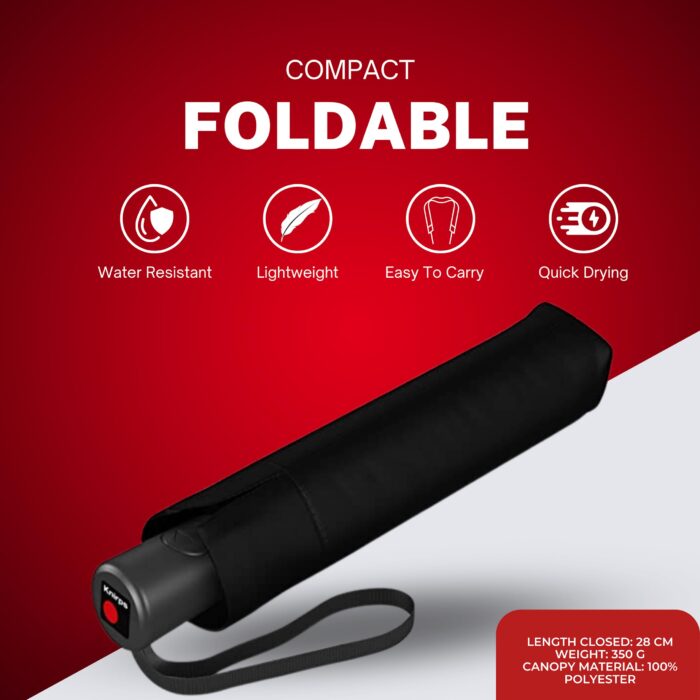 • Klein und leicht wiegt der Schirm nur ca. 350 Gramm. Geöffnet ist das Schirmdach 97 cm groß. Geschlossen misst der Regenschirm 28 cm.